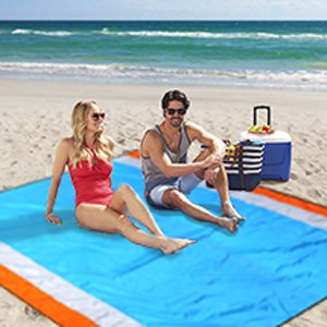 This beach mat rolls up really small in its own carrying case, comes with anchors to help it stay down in the sand, holds 5-6 people comfortably and doesn’t hold on to sand, heat or wetness. It’s perfect for the beach.